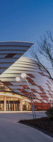 大剧院将成为电影节开幕式及颁奖典礼的圣殿。光洁的金属表面与带状纹路模仿贝壳造型,“贝壳”的设计理念延展至室内休息大厅及观众厅。